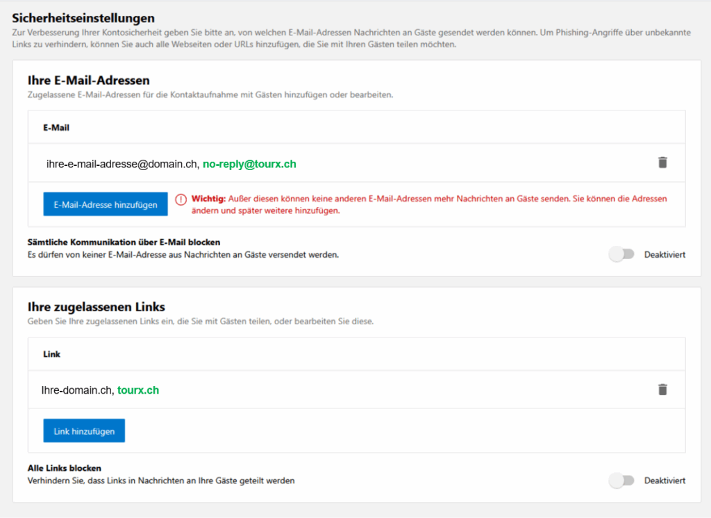 Damit der persönliche Link der Gästekarte nicht aus der E-Mail entfernt wird, sollte zusätzlich noch folgende Einstellungen bei «Ihre zugelassene Links» ergänzt werden: